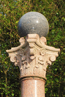 a red and grey granite column diagonally carved and topped by a grey granite