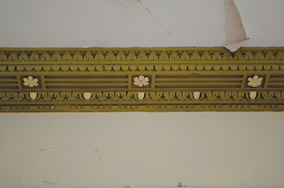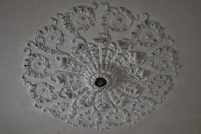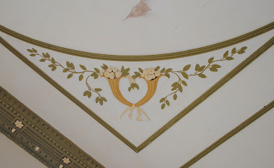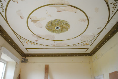 house is luckily one of the most intact rooms to survive, and here a ceiling depicting musical instruments and foliage awaits redecoration, replacing the strong garish colours of its